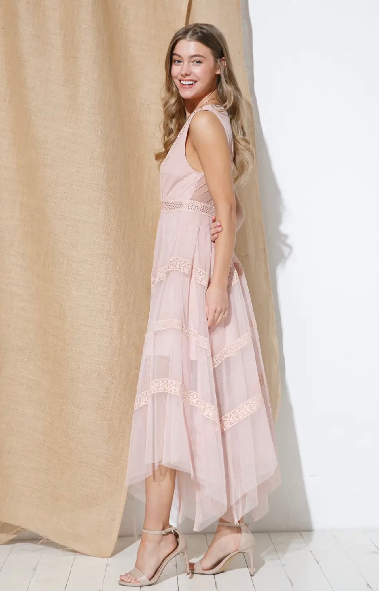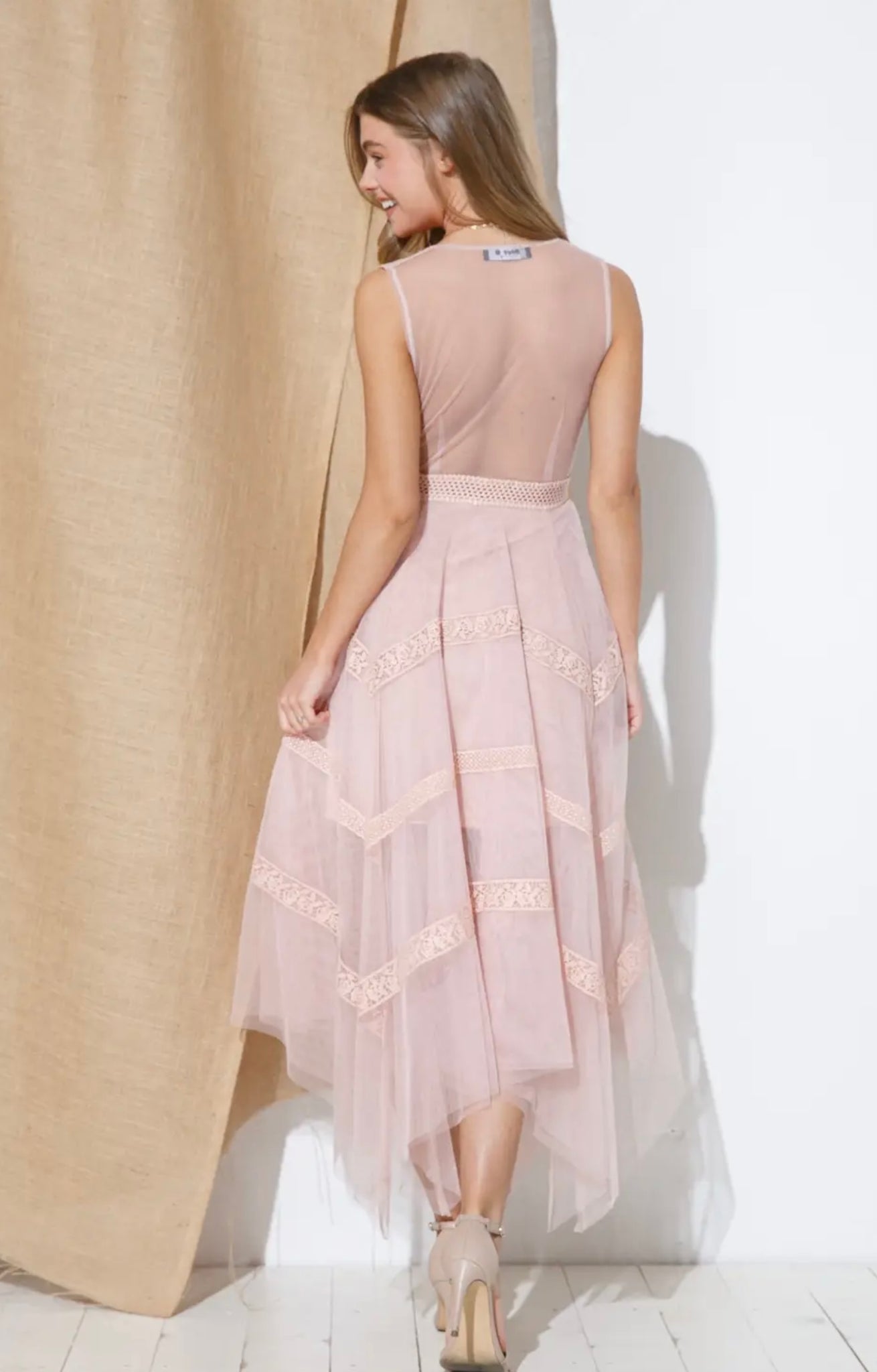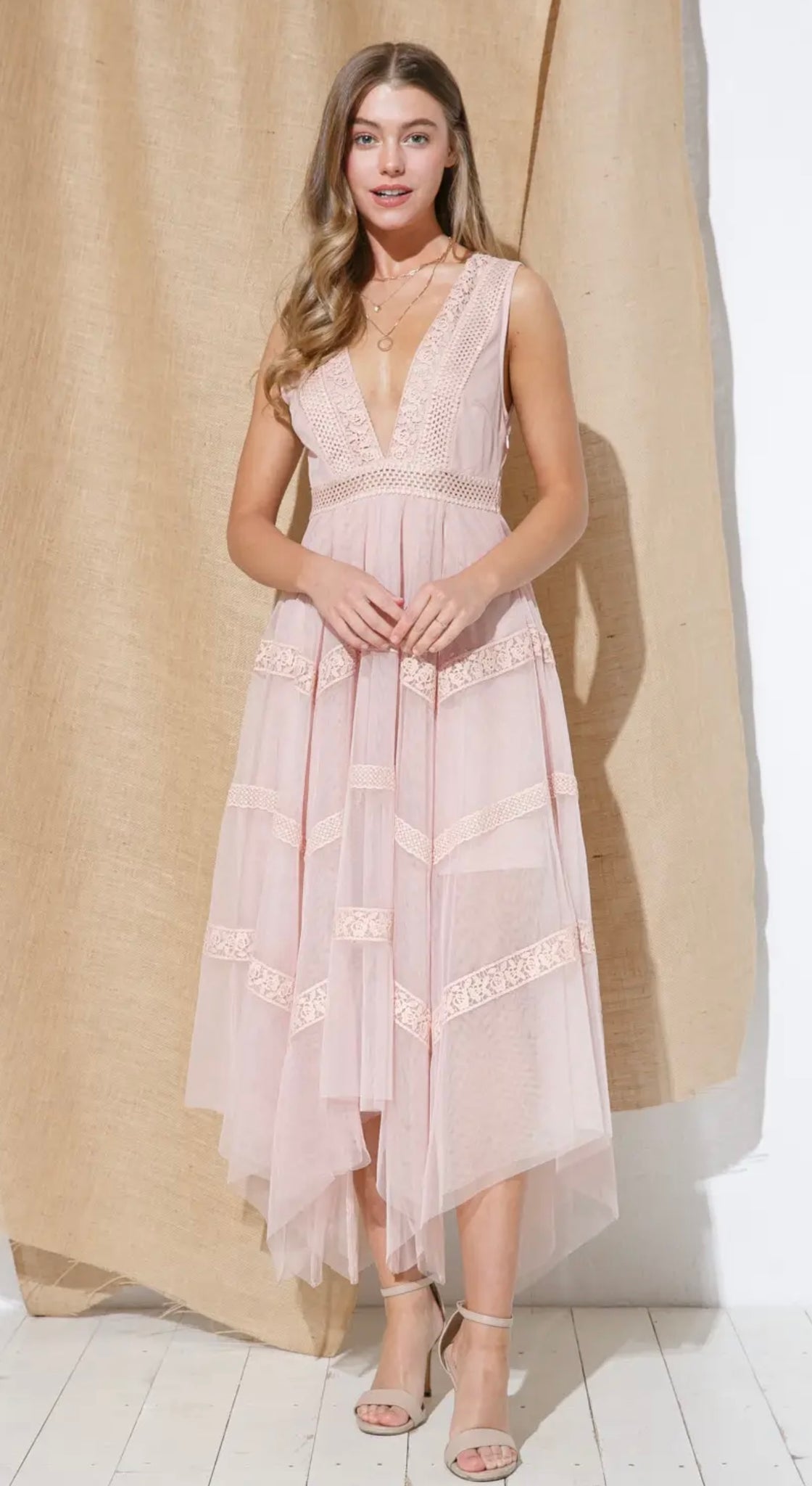 Sofia Dress is in a beautiful dusty pink color. Dress is a nude lace mesh with a handkerchief hem. The Sofia dress sits at a midi length, has a nude lined, and a very deep V neckline. Dress also have a hidden side zipper and an open mesh back.